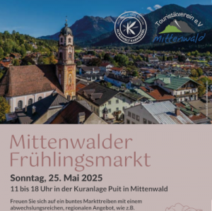 Erleben Sie den Zauber des Frühlings beim Mittenwalder Frühlingsmarkt am 25. Mai in der malerischen Puit! Von 10:00 bis 18:00 Uhr erwartet Sie ein buntes Treiben mit zahlreichen Ständen, die regionale Produkte, Kunsthandwerk und kulinarische Köstlichkeiten anbieten.